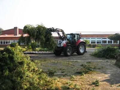 De nächsde Schritt keem denn an 5. Oktober, Dor hebbt sick moorns opn Schoolhoff een poor Gemeindevertreter infunn, um een poor Bööm afftonehm, de de nieden Sooken in Wech stünn. An de Steed kummt de Pavillon hin un de Opgang no den Schoolhoff ward ok anners mookt. (Veelen Dank an Gerhard Rohwedder för de Biller vun dat Boom-Affnehm)
