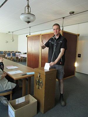 Bei herrlichem Sommerwetter steht der erste Wähler schon vor 8:00 vor dem Wahllokal, muss sich aber für die Stimmabgabe noch ein paar Minuten gedulden.