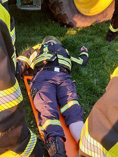 Bei einer der ersten Übungen ging es um Rettung einer bewußtlosen Person von einem Traktor. Dabei erwies sich das freiwillige Opfer nicht nur vom Dienstgrad her als Schwergewicht, sondern war mit Körperproportionen im Gardemaß nicht so einfach unbeschadet durch die enge Kabinentür aus dem Trecker heraus zu bekommen.